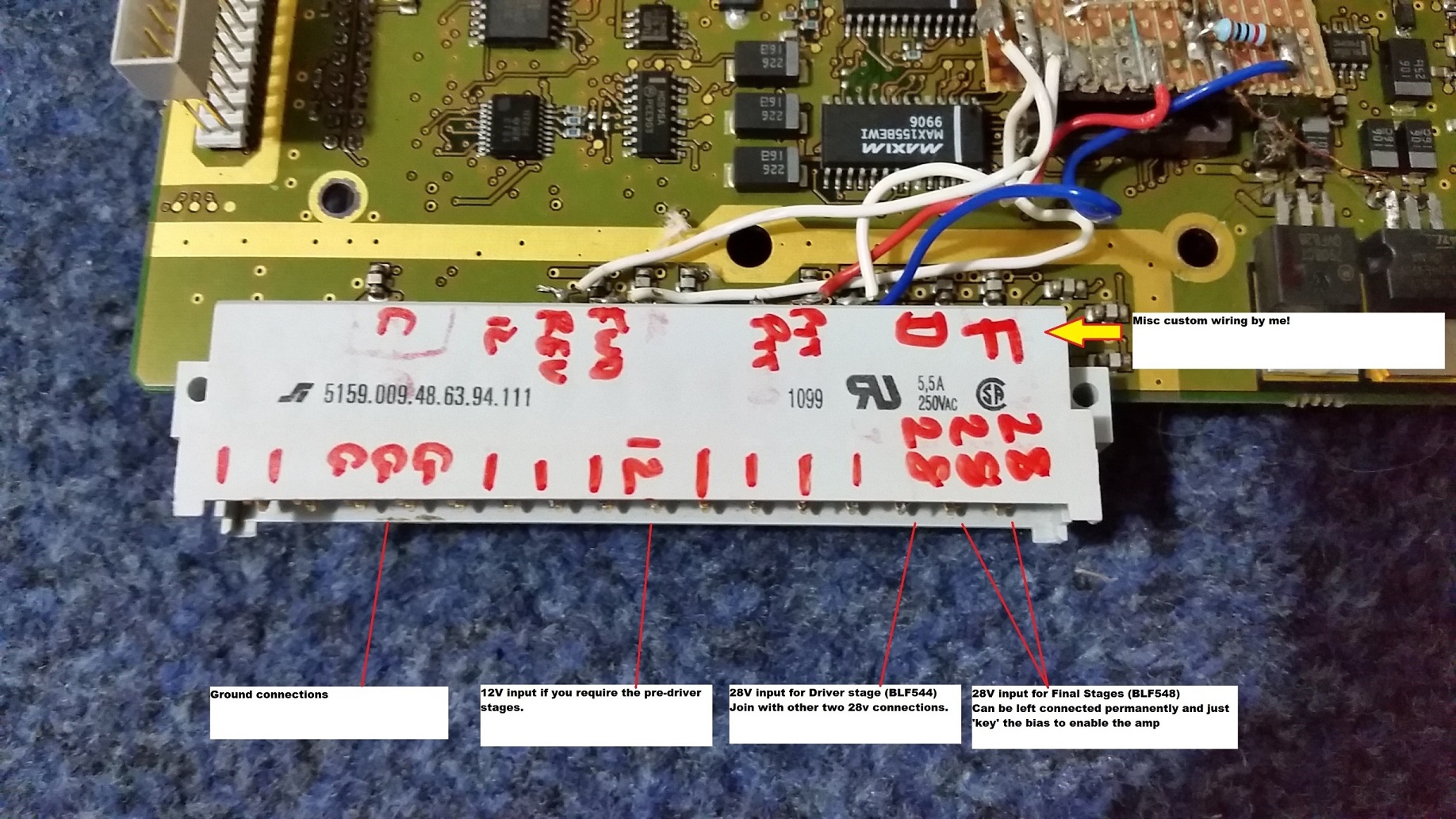 See below for photos. I have cut pins to use for other connections like PTT & Detector. I have used multiple pins for Ground and +28V input as that is where the main current is drawn. There are SWR and Temperature indicators on the board but i have not used them.